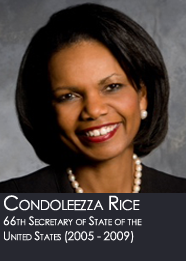 From January 2005-2009, Rice served as the 66th Secretary of State of the United States, the second woman and first African American woman to hold the post. Rice also served as President George W. Bush's Assistant to the President for National Security Affairs (National Security Advisor) from January 2001-2005, the first woman to hold the position.