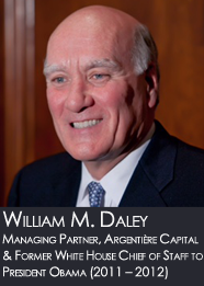 William Daley is a Managing Partner and Head of US Operations for Argentiere Capital. Prior to joining Argentiere in May 2014, Mr Daley served as President Obama's Chief of Staff from January 2011 until January 2012, and was involved in all aspects and issues faced by the President and the administration, both domestic and foreign. Mr. Daley was Vice Chairman of JPMorgan Chase, Inc and Chairman of the Midwest Region of the U.S. from 2004 until 2011, serving on the firm's Operating Committee and was Head of JPMorgan Chase's Office of Corporate Responsibility. From 2001 until 2004, Mr Daley was President of SBC Communications, and in 2000, he coordinated the effort for permanent Normal Trade Relations with China and chaired Vice President Al Gore's presidential campaign. From 1997 to 2000 Mr Daley served as U.S. Secretary of Commerce under President Clinton. Prior to his career in public service, he was a partner at the law firm of Mayer, Brown & Platt; President and Chief Operating Officer of Amalgamated Bank of Chicago; and a lawyer at the firm of Daley and George. Mr Daley served on the corporate Boards of Directors of Abbott Laboratories, The Boeing Company, Boston Properties, Inc., EDS and Merck & Co. He currently serves on the Boards of Directors of Advance Illinois, the Art Institute of Chicago, Chicago Community Trust, Chicago Council on Global Affairs, Innovation Foundation, Inc. and Third Way. He earned an LL.B. from John Marshall Law School and a B.A. from Loyola University in Chicago.