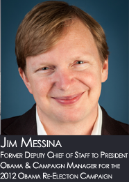 The mastermind behind President Obama's 2012 re-election campaign, Jim Messina seized the reins on what Bloomberg Businessweek dubbed "the highest-wattage crash course in executive management ever undertaken" and succeeded, earning the President another term in the White House. With the guidance of technology's foremost leaders, Messina abandoned every step of a traditional presidential campaign and merged technology and politics in a way that was both unpredictable and unprecedented. Messina's strategies established the modern presidential campaign - Google's Executive Chairman Eric Schmidt called it "the best-run campaign ever." The American Association of Political Consultants later crowned him the Campaign Strategist of the Year.